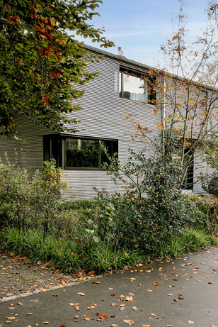 Auf der Basis eines Gestaltungsplans von Einfamilien- und Doppeleinfamilienhäuser entstand das formal reduzierte, grosszügige Einfamilienhaus. Der präzise und klar geschnittene zweigeschossige Gebäudekörper mit der südseitigen Veranda- und Balkonschicht ist vollständig mit einer horizontalen offenen Holzschalung eingekleidet. Darin integriert sind verschiebbare Flächen, welche die Verandaseiten und Fenster nach Bedarf vor Einblicken oder Licht schützen und so das Gebäude je nach deren Position ganz unterschiedlich erscheinen lässt.