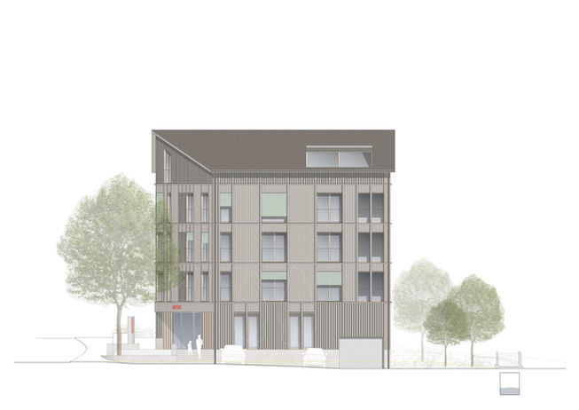 Der Holzbau mit Betonsockel ist horizontal gegliedert in Erdgeschoss, drei Regelgeschosse und ein Dachgeschoss.