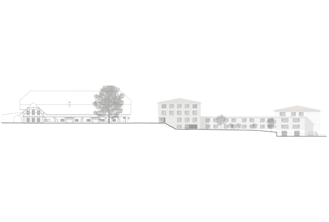 Mit den beiden Hauptvolumen des neuen Wohn- und Pflegheims wird der Weiler in ein neues Gleichgewicht gebracht, die ursprüngliche Wegkreuzung, die Kapelle und der Hof mit der prägenden Linde so wieder ins Zentrum gerückt.